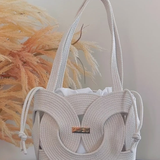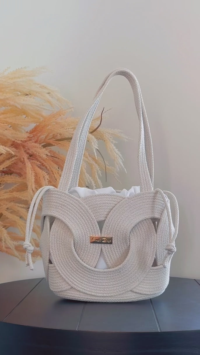 Inspired by contemporary sculpture, the Cream Handmade Rope Bag features a beautifully crafted circular weave and elegant knotted detailing. Made from high-quality cotton rope, the Shoulder bag combines structure with softness, giving it a refined yet relaxed aesthetic. The interior fabric pouch cinches closed to protect your belongings while adding a delicate, cloud-like finish. Whether for daily use or special occasions, the Cream Handmade Rope Bag brings elevated craftsmanship and effortless style to your wardrobe.